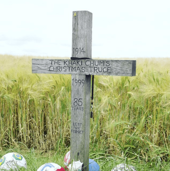 On the northern edge of the wood, facing the leeward slopes of Messines Ridge stands a wooden memorial cross erected to commemorate the activities of a group of fine historians known as the Khaki Chums, who spent Christmas of 1999 in the field behind the cross, commemorating the 85th anniversary of the Christmas Truce. There is no doubt that in this field, fraternisation and interaction took place between the British and Germans on that first wartime Christmas in 1914. As you can see from the picture above, it remains a site of pilgrimage to this day, with many visitors leaving a football to commemorate the football match that took place between the Germans and the British. Or did it?